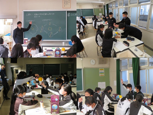 3年生の理科の授業では「天体」に関わる学習をしています。今日は「なぜ日本には四季があるのか?」という課題をみんなで考えていました。3年学年主任の森上先生がさまざまな道具を準備して生徒に考えさせていました。先生が準備した道具を上手に使ってグループで考えていました。グループによっては、自分が持っている消しゴムなども利用して考えていました。3年生にもなると工夫は当然ですが、自分の意見を述べたあと、他人の意見にも耳を傾けてより高い考え方になるよう努力していました。さて、3年生のみなさん、なぜ四季が発生するのかわかりましたか?