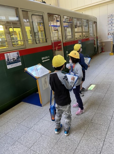 とてもよい天気です。今日は、2の3と2の4が生活科まちたんけんで近くのレトロ電車館へ出かけました。味のある展示物を見て、「無限列車みたい!」と大喜びです。赤池小学校の近くには魅力的なところがたくさんありますね。学校に帰ってきたら、見つけたことや楽しかったことをたくさんおしえてください。炭治郎はいたのかなあ。