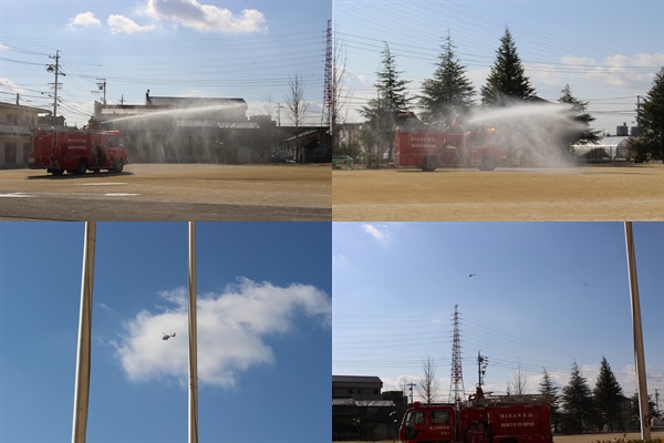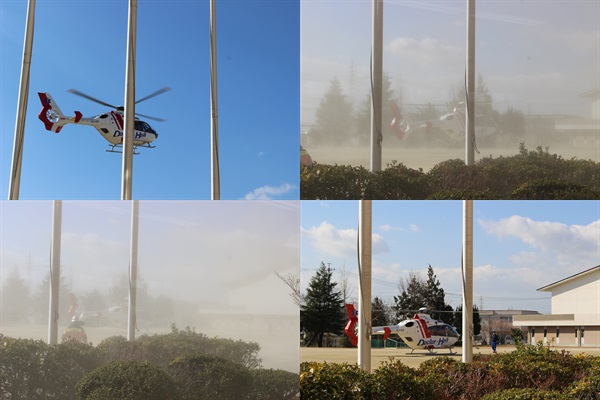 突然の「ドクターヘリ」の着陸要請で、一時、校舎内に待機させました。