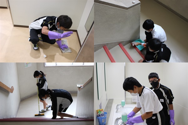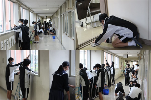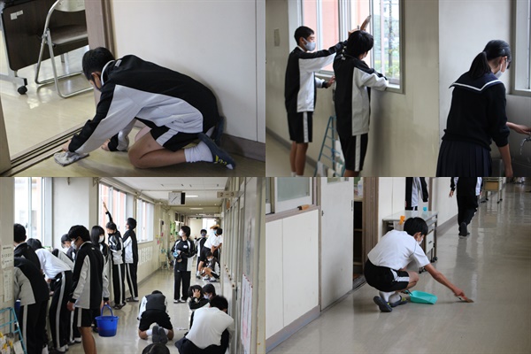 いつもは、運動場などで清掃をしている子どもたちも「校舎内」で
