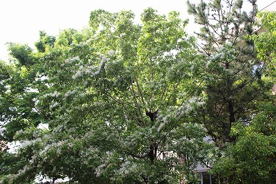 「朋友の泉」の上には、「ナンジャモンジャ」の木が花を咲かせています。