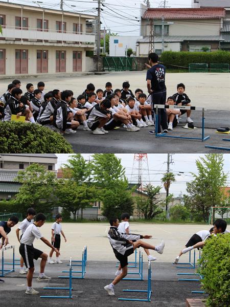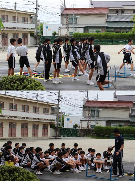 馬場先生が、運動場で「ハードルの授業」を行っています。