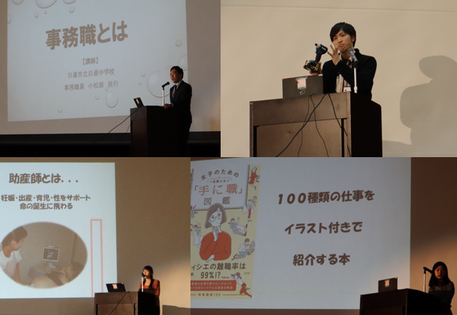事務職・看護師・エンジニア・フリーライター・住宅会社・システムエンジニア・アナウンサーの七名の方に、仕事の内容や必要な資質、中学生のうちにがんばっておくことなどをお話していただきました。多くの方から中学生のうちに「コミュニケーションをとって仲間と協力すること」「失敗を恐れず挑戦していろいろな経験をすること」で大人になるための「土台」をつくっておいてほしいとのお言葉をいただきました。