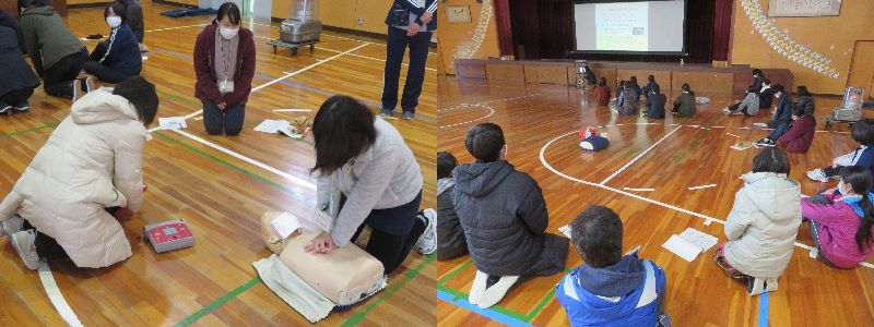 講師の石黒養護教諭は、事前に分かりやすいスライドを作成したり日進消防署からトレーニング用マネキンを3体借りてきたりしました。そのおかげで大変充実した講習となりました。本校には、実際に心肺蘇生を経験した教員がいます。学校外で大人に対して行ったということですが、毎年学校で実施している基礎救命講習が大いに役立ったそうです。