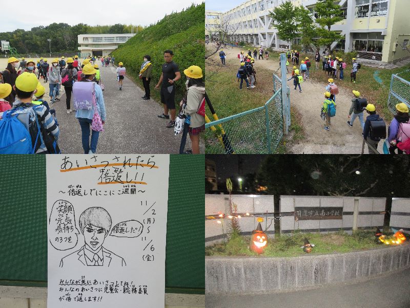 さて、ハロウィンは終わりましたが、我が校のジャック・オー・ランタンはもうしばらく飾られています。来校した際は、是非、ご覧ください。写真は、暗がりで光る正門前の様子です。