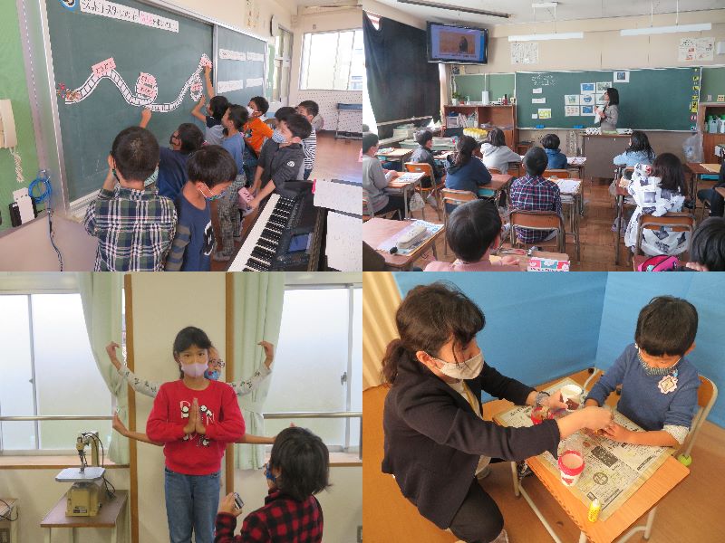 ※写真は、専科教員による研究授業(音楽・外国語・図工)と本日の研究授業(にじ組)の様子です。