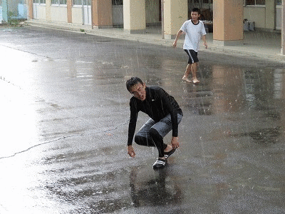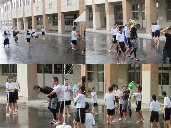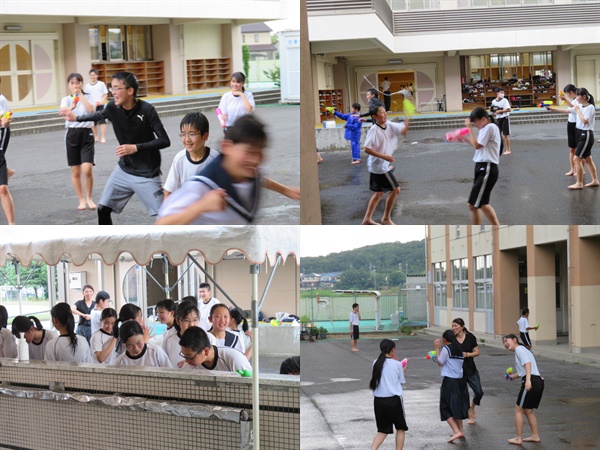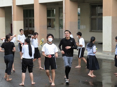 奥村先生も入って一緒に楽しんでいました。生徒と一緒にずぶぬれになって楽しむことができる奥村先生、素晴らしいと思いました。「楽しむときは、子どもたちとともに一緒に楽しむ」というこの気持ちはずっと忘れずに教員の道を進んでほしいと思います。(もちろん、担任の花田先生もずぶぬれでした・・・・。)