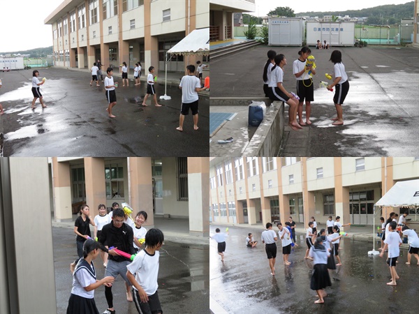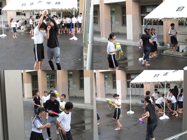 2年5組が学級で話し合いをしてレクを企画しました。そして、6限に「水遊び」を行いました。雨が降ってきたものの、水遊びであったので、濡れることはお構いなし。着替えもばっちり準備してあるので、生徒も大いに盛り上がっていました。でも、いちばん楽しんでいたのは先生(?)かも・・・・。生徒もここぞとばかりの逆襲(?)で水鉄砲・バケツを使って水をかけていました。