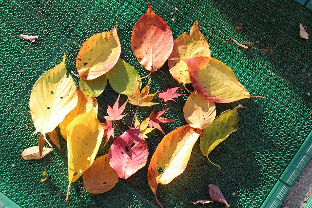 そこで、紅葉した葉や紅葉しかかった葉、枯れた葉を集めて「記念撮影」をしました。