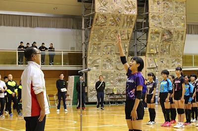 選手宣誓を「愛日地区を代表して、女子バレー部主将の青柳さんが立派に行いました!」