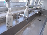各学年廊下の手洗い場には手洗い液を設置し、頻繁、入念な手洗いを励行していきます。
