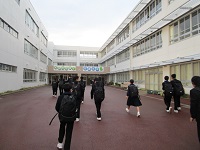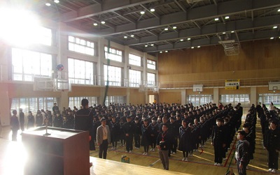 寒さに負けることなく、8時27分には全校生徒が体育館に集合し朝会を始めることができました。