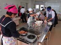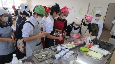 授業開始チャイムが鳴る前から、エプロン、マスク、ナフキンに身を包んだ料理人が次々と入室し、各班で必要な材料を持ち運んでいきます。