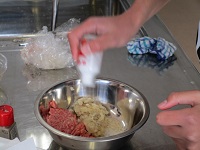 前回炒めた玉ねぎとひき肉を入れて、塩コショウも加えよく混ぜます。