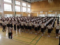 久しぶりに子どもたちが登校し、はじめに体育館で集会を行いました。